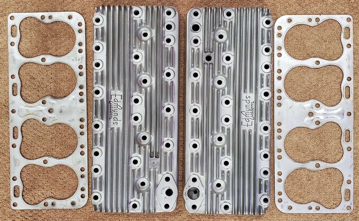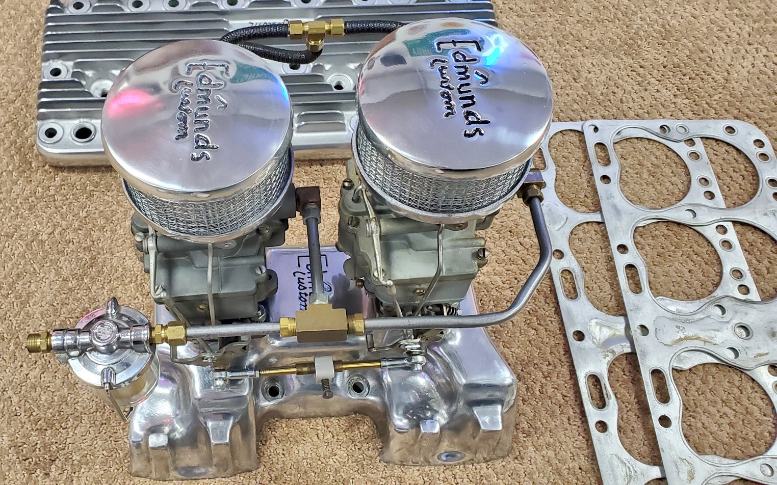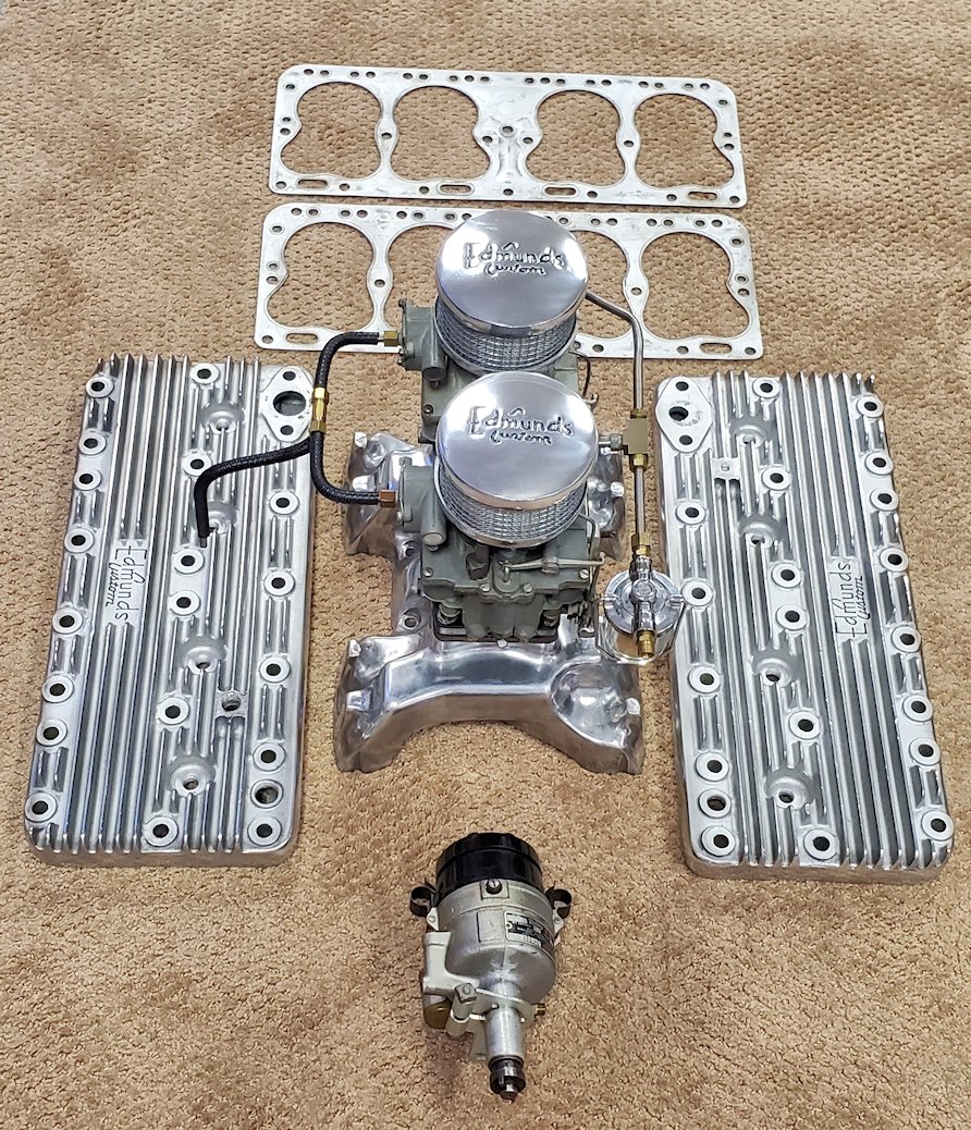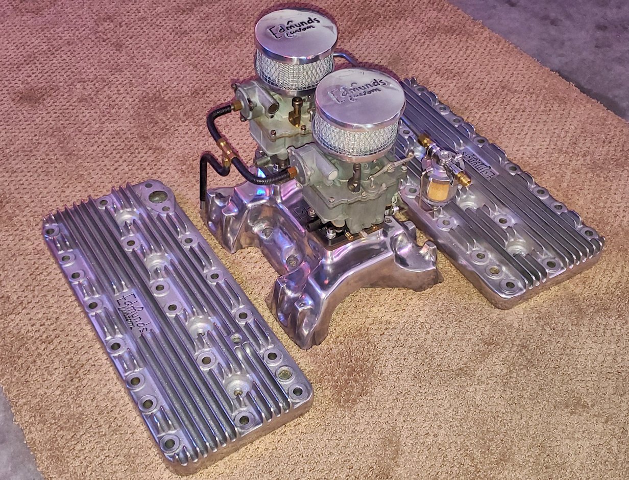 Complete matched set of Edmunds Custom Speed Equipment for 1936-1948 Cadillac flatheads. Includes two Stromberg AAV-26 Carburetors with linkage, fuel supply and choke stove linkage. Also included is a Mallory dual point distributor specifically for the flathead Cadillacs. All parts are clean and look to be in excellent shape. The two air filters are reproductions but match the heads and intake manifold. Extremely rare “old school” setup for your flathead. A rare opportunity to own this hard to find matched set.