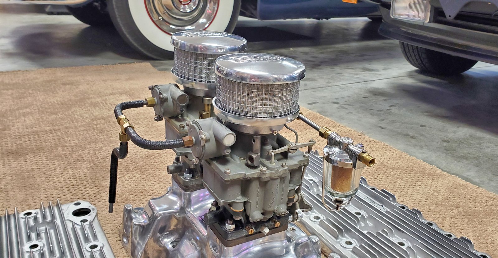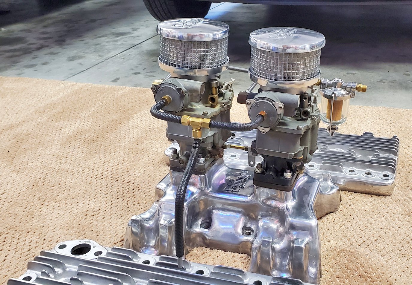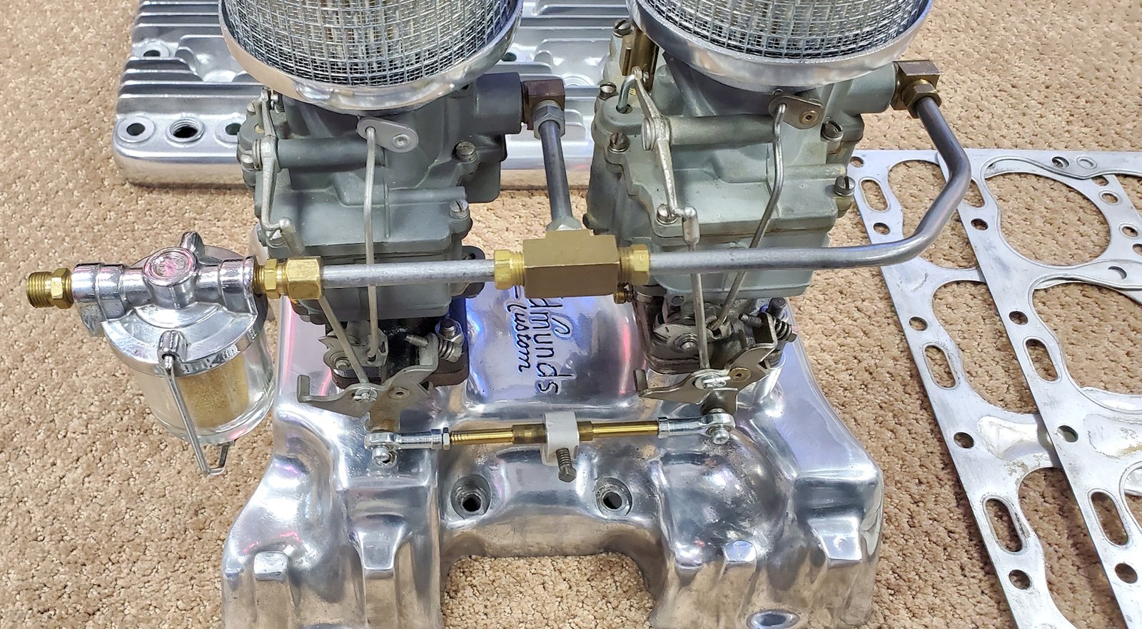 Complete matched set of Edmunds Custom Speed Equipment for 1936-1948 Cadillac flatheads. Includes two Stromberg AAV-26 Carburetors with linkage, fuel supply and choke stove linkage. Also included is a Mallory dual point distributor specifically for the flathead Cadillacs. All parts are clean and look to be in excellent shape. The two air filters are reproductions but match the heads and intake manifold. Extremely rare “old school” setup for your flathead. A rare opportunity to own this hard to find matched set.